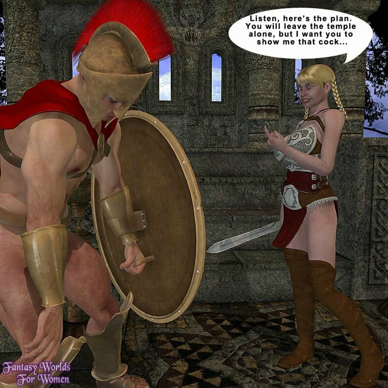 When Lexi defends Brigit's temple against a lone Spartan warrior, he figures he has her beat. When she goes in and cuts his briefs and serves his cock on her sword, he vows he'll do anything if she won't cut it off. Seeing the size of his weapon, Lexi puts it to good use giving her orgasms!
